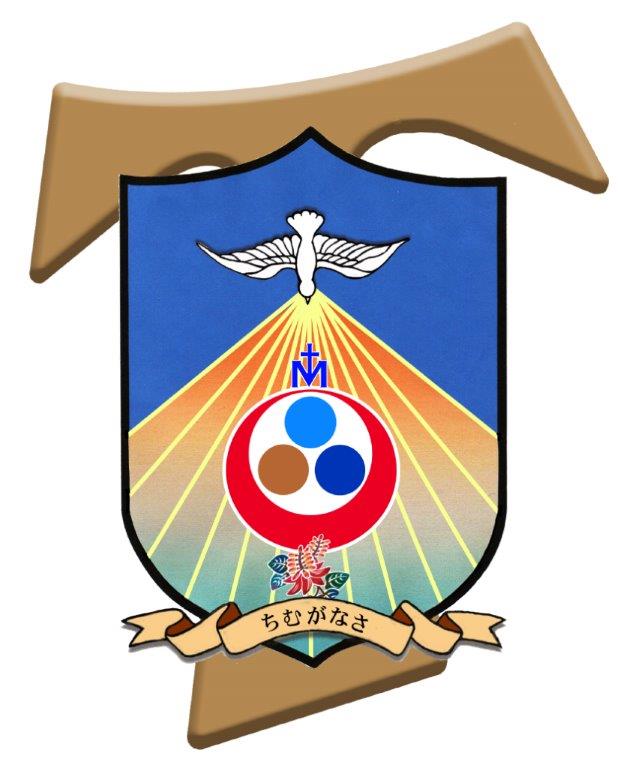 紋章の背景には大きなフランシスカンの“タウの十字架”があります。それは那覇教区の歴代の司教がすべてフランシスカンであり、その司教職を通して主イエス・キリストご自身が沖縄に寄り添っていらっしゃることを意味しています。